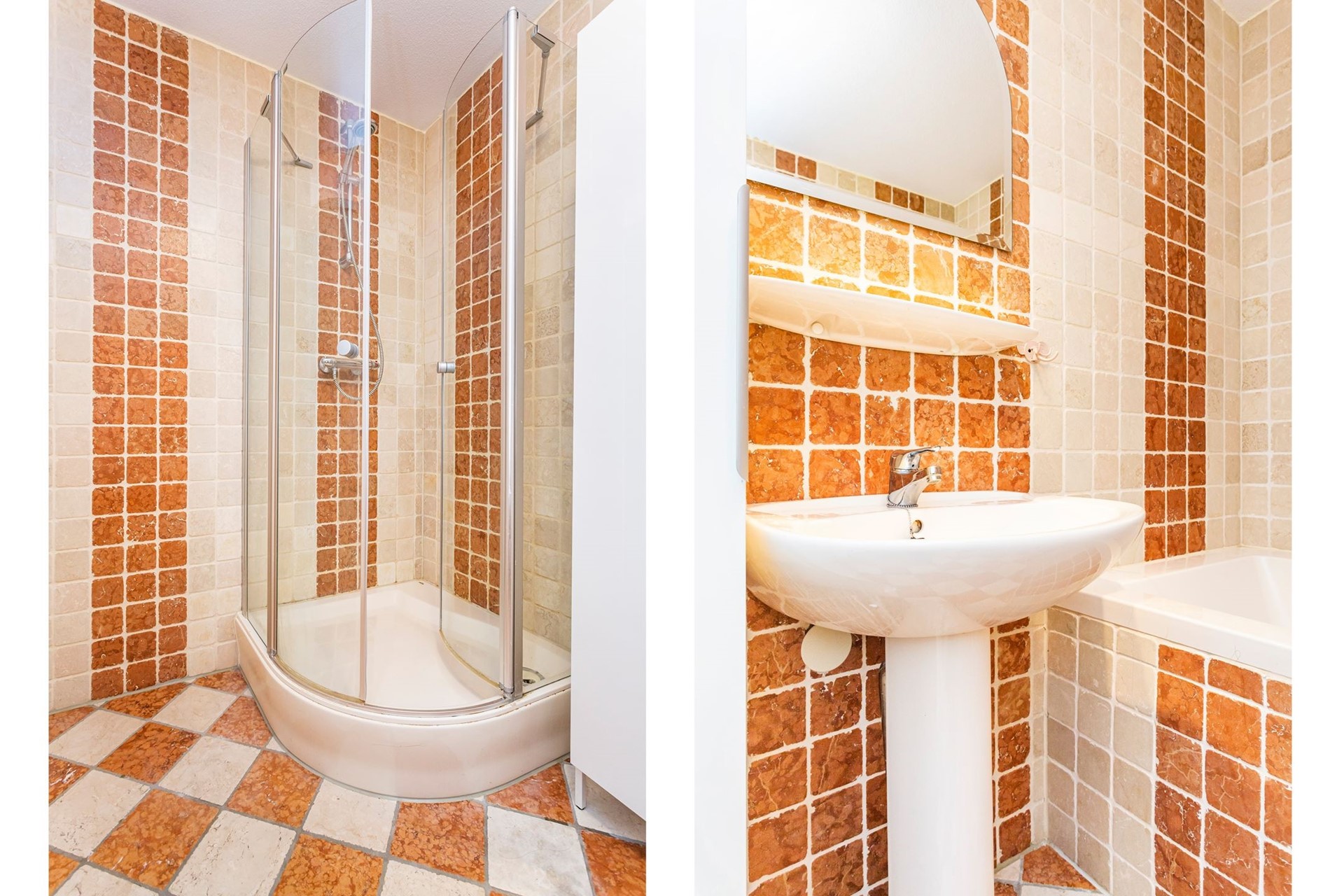 De badkamer is voorzien van een douche , whirlpool en wastafelmeubel.