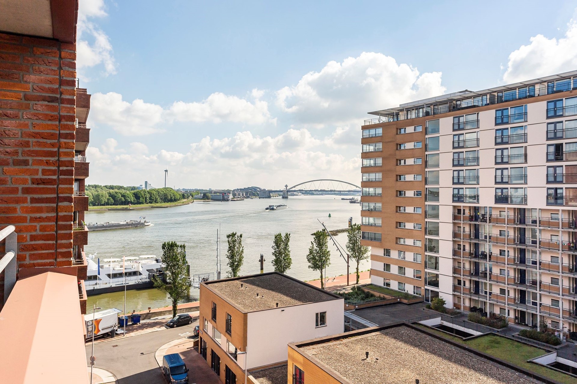 7e verdieping: Ruime gang richting nummer 70. Bij binnenkomst een L vormige gang met aangrenzende vertrekken. Aan de linkerzijde, de Oostzijde, van het appartement is de ruime woonkamer te vinden met een schuifpui naar het balkon. Vanaf het balkon heeft u een voortreffelijk uitzicht op de Maas en de Brienenoordbrug. Tevens geniet u vanaf het balkon van een heerlijke ochtend en vroege middag zon. In de woonkamer heeft een open keuken met inbouw oven en elektrische kookplaat, een vrijstaande vaatwasser en - koel-vriescombinatie.
